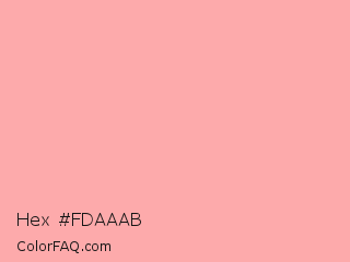 Hex #fdaaab Color is a very light red color and the nearest color is Cornflower Lilac #ffb0ac. Hex code #fdaaab and RGB value is rgb(253,170,171). In RGB color space, this color is composed of 99% red, 67% green, 67% blue, In CMYK color space, this color is composed of 0% cyan, 33% magenta, 32% yellow , 1% black , In HSL color space, this color has a hue angle of 359° , 95% saturation and 83% lightness.