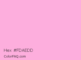 Hex #fdaedd Color is a very light magenta color and the nearest color is Light Hot Pink #ffb3de. Hex code #fdaedd and RGB value is rgb(253,174,221). In RGB color space, this color is composed of 99% red, 68% green, 87% blue, In CMYK color space, this color is composed of 0% cyan, 31% magenta, 13% yellow , 1% black , In HSL color space, this color has a hue angle of 324° , 95% saturation and 84% lightness.