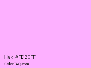 Hex #fdb0ff Color is a very light magenta color and the nearest color is Electric Lavender #f4bbff. Hex code #fdb0ff and RGB value is rgb(253,176,255). In RGB color space, this color is composed of 99% red, 69% green, 100% blue, In CMYK color space, this color is composed of 1% cyan, 31% magenta, 0% yellow , 0% black , In HSL color space, this color has a hue angle of 298° , 100% saturation and 85% lightness.