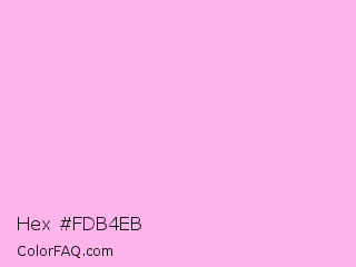 Hex #fdb4eb Color is a very light magenta color and the nearest color is Light Hot Pink #ffb3de. Hex code #fdb4eb and RGB value is rgb(253,180,235). In RGB color space, this color is composed of 99% red, 71% green, 92% blue, In CMYK color space, this color is composed of 0% cyan, 29% magenta, 7% yellow , 1% black , In HSL color space, this color has a hue angle of 315° , 95% saturation and 85% lightness.