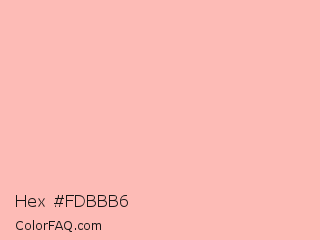 Hex #fdbbb6 Color is a very light red color and the nearest color is Melon #fdbcb4. Hex code #fdbbb6 and RGB value is rgb(253,187,182). In RGB color space, this color is composed of 99% red, 73% green, 71% blue, In CMYK color space, this color is composed of 0% cyan, 26% magenta, 28% yellow , 1% black , In HSL color space, this color has a hue angle of 4° , 95% saturation and 85% lightness.