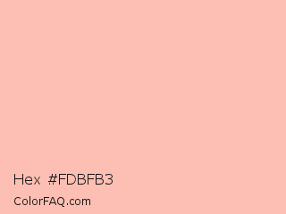 Hex #fdbfb3 Color is a very light red color and the nearest color is Melon #fdbcb4. Hex code #fdbfb3 and RGB value is rgb(253,191,179). In RGB color space, this color is composed of 99% red, 75% green, 70% blue, In CMYK color space, this color is composed of 0% cyan, 25% magenta, 29% yellow , 1% black , In HSL color space, this color has a hue angle of 10° , 95% saturation and 85% lightness.