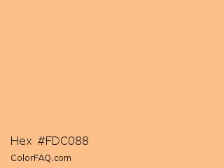 Hex #fdc088 Color is a light orange color and the nearest color is Macaroni And Cheese #ffbd88. Hex code #fdc088 and RGB value is rgb(253,192,136). In RGB color space, this color is composed of 99% red, 75% green, 53% blue, In CMYK color space, this color is composed of 0% cyan, 24% magenta, 46% yellow , 1% black , In HSL color space, this color has a hue angle of 29° , 97% saturation and 76% lightness.