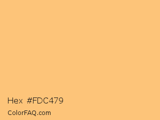 Hex #fdc479 Color is a light orange color and the nearest color is Topaz #ffc87c. Hex code #fdc479 and RGB value is rgb(253,196,121). In RGB color space, this color is composed of 99% red, 77% green, 47% blue, In CMYK color space, this color is composed of 0% cyan, 23% magenta, 52% yellow , 1% black , In HSL color space, this color has a hue angle of 34° , 97% saturation and 73% lightness.