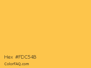 Hex #fdc54b Color is a light orange color and the nearest color is Saffron Mango #f9bf58. Hex code #fdc54b and RGB value is rgb(253,197,75). In RGB color space, this color is composed of 99% red, 77% green, 29% blue, In CMYK color space, this color is composed of 0% cyan, 22% magenta, 70% yellow , 1% black , In HSL color space, this color has a hue angle of 41° , 98% saturation and 64% lightness.