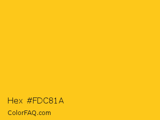 Hex #fdc81a Color is a normal yellow color and the nearest color is Deep Lemon #f5c71a. Hex code #fdc81a and RGB value is rgb(253,200,26). In RGB color space, this color is composed of 99% red, 78% green, 10% blue, In CMYK color space, this color is composed of 0% cyan, 21% magenta, 90% yellow , 1% black , In HSL color space, this color has a hue angle of 46° , 98% saturation and 55% lightness.