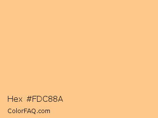 Hex #fdc88a Color is a light orange color and the nearest color is Chardonnay #ffcd8c. Hex code #fdc88a and RGB value is rgb(253,200,138). In RGB color space, this color is composed of 99% red, 78% green, 54% blue, In CMYK color space, this color is composed of 0% cyan, 21% magenta, 45% yellow , 1% black , In HSL color space, this color has a hue angle of 32° , 97% saturation and 77% lightness.