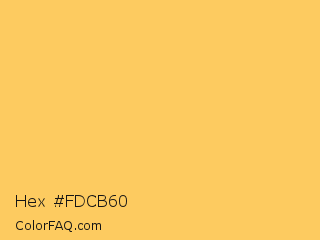 Hex #fdcb60 Color is a light orange color and the nearest color is Golden Tainoi #ffcc5c. Hex code #fdcb60 and RGB value is rgb(253,203,96). In RGB color space, this color is composed of 99% red, 80% green, 38% blue, In CMYK color space, this color is composed of 0% cyan, 20% magenta, 62% yellow , 1% black , In HSL color space, this color has a hue angle of 41° , 98% saturation and 68% lightness.