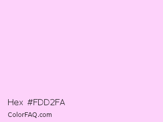 Hex #fdd2fa Color is a very light magenta color and the nearest color is Shampoo #ffcff1. Hex code #fdd2fa and RGB value is rgb(253,210,250). In RGB color space, this color is composed of 99% red, 82% green, 98% blue, In CMYK color space, this color is composed of 0% cyan, 17% magenta, 1% yellow , 1% black , In HSL color space, this color has a hue angle of 304° , 91% saturation and 91% lightness.