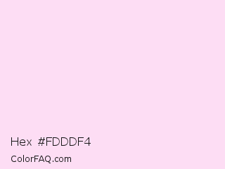 Hex #fdddf4 Color is a very light magenta color and the nearest color is Pink Lace #ffddf4. Hex code #fdddf4 and RGB value is rgb(253,221,244). In RGB color space, this color is composed of 99% red, 87% green, 96% blue, In CMYK color space, this color is composed of 0% cyan, 13% magenta, 4% yellow , 1% black , In HSL color space, this color has a hue angle of 317° , 89% saturation and 93% lightness.