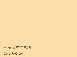 Hex #fddea8 Color is a very light orange color and the nearest color is Navajo White #ffdead. Hex code #fddea8 and RGB value is rgb(253,222,168). In RGB color space, this color is composed of 99% red, 87% green, 66% blue, In CMYK color space, this color is composed of 0% cyan, 12% magenta, 34% yellow , 1% black , In HSL color space, this color has a hue angle of 38° , 96% saturation and 83% lightness.
