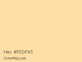 Hex #fddfa5 Color is a very light orange color and the nearest color is Cream Brulee #ffe5a0. Hex code #fddfa5 and RGB value is rgb(253,223,165). In RGB color space, this color is composed of 99% red, 87% green, 65% blue, In CMYK color space, this color is composed of 0% cyan, 12% magenta, 35% yellow , 1% black , In HSL color space, this color has a hue angle of 40° , 96% saturation and 82% lightness.