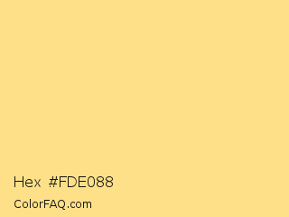 Hex #fde088 Color is a light orange color and the nearest color is Salomie #fedb8d. Hex code #fde088 and RGB value is rgb(253,224,136). In RGB color space, this color is composed of 99% red, 88% green, 53% blue, In CMYK color space, this color is composed of 0% cyan, 11% magenta, 46% yellow , 1% black , In HSL color space, this color has a hue angle of 45° , 97% saturation and 76% lightness.