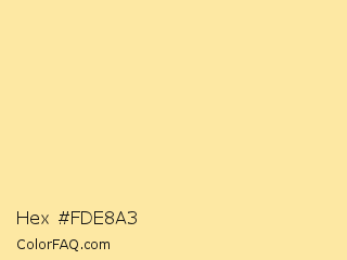 Hex #fde8a3 Color is a very light yellow color and the nearest color is Cream Brulee #ffe5a0. Hex code #fde8a3 and RGB value is rgb(253,232,163). In RGB color space, this color is composed of 99% red, 91% green, 64% blue, In CMYK color space, this color is composed of 0% cyan, 8% magenta, 36% yellow , 1% black , In HSL color space, this color has a hue angle of 46° , 96% saturation and 82% lightness.