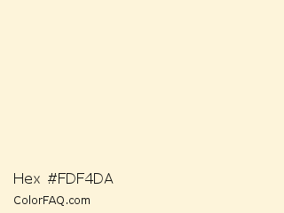 Hex #fdf4da Color is a very light orange color and the nearest color is Half Spanish White #fef4db. Hex code #fdf4da and RGB value is rgb(253,244,218). In RGB color space, this color is composed of 99% red, 96% green, 85% blue, In CMYK color space, this color is composed of 0% cyan, 4% magenta, 14% yellow , 1% black , In HSL color space, this color has a hue angle of 45° , 90% saturation and 92% lightness.