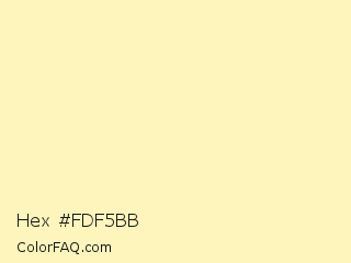Hex #fdf5bb Color is a very light yellow color and the nearest color is Blond #faf0be. Hex code #fdf5bb and RGB value is rgb(253,245,187). In RGB color space, this color is composed of 99% red, 96% green, 73% blue, In CMYK color space, this color is composed of 0% cyan, 3% magenta, 26% yellow , 1% black , In HSL color space, this color has a hue angle of 53° , 94% saturation and 86% lightness.