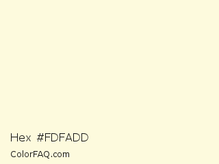 Hex #fdfadd Color is a very light yellow color and the nearest color is Scotch Mist #fffbdc. Hex code #fdfadd and RGB value is rgb(253,250,221). In RGB color space, this color is composed of 99% red, 98% green, 87% blue, In CMYK color space, this color is composed of 0% cyan, 1% magenta, 13% yellow , 1% black , In HSL color space, this color has a hue angle of 54° , 89% saturation and 93% lightness.