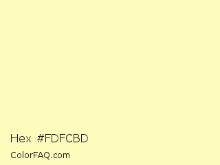 Hex #fdfcbd Color is a very light yellow color and the nearest color is Very Pale Yellow #ffffbf. Hex code #fdfcbd and RGB value is rgb(253,252,189). In RGB color space, this color is composed of 99% red, 99% green, 74% blue, In CMYK color space, this color is composed of 0% cyan, 0% magenta, 25% yellow , 1% black , In HSL color space, this color has a hue angle of 59° , 94% saturation and 87% lightness.