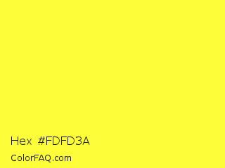 Hex #fdfd3a Color is a light yellow color and the nearest color is Maximum Yellow #fafa37. Hex code #fdfd3a and RGB value is rgb(253,253,58). In RGB color space, this color is composed of 99% red, 99% green, 23% blue, In CMYK color space, this color is composed of 0% cyan, 0% magenta, 77% yellow , 1% black , In HSL color space, this color has a hue angle of 60° , 98% saturation and 61% lightness.