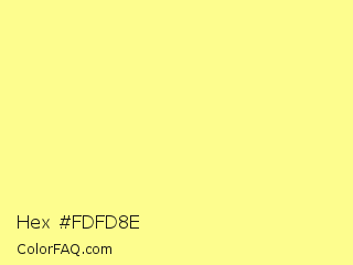 Hex #fdfd8e Color is a light yellow color and the nearest color is Dolly #f9ff8b. Hex code #fdfd8e and RGB value is rgb(253,253,142). In RGB color space, this color is composed of 99% red, 99% green, 56% blue, In CMYK color space, this color is composed of 0% cyan, 0% magenta, 44% yellow , 1% black , In HSL color space, this color has a hue angle of 60° , 97% saturation and 77% lightness.