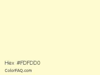 Hex #fdfdd0 Color is a very light yellow color and the nearest color is Cream #fffdd0. Hex code #fdfdd0 and RGB value is rgb(253,253,208). In RGB color space, this color is composed of 99% red, 99% green, 82% blue, In CMYK color space, this color is composed of 0% cyan, 0% magenta, 18% yellow , 1% black , In HSL color space, this color has a hue angle of 60° , 92% saturation and 90% lightness.