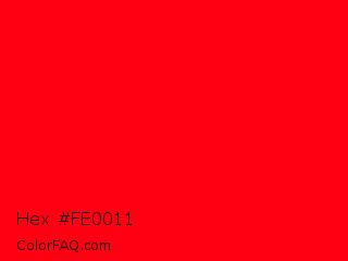 Hex #fe0011 Color is a normal red color and the nearest color is Red #ff0000. Hex code #fe0011 and RGB value is rgb(254,0,17). In RGB color space, this color is composed of 100% red, 0% green, 7% blue, In CMYK color space, this color is composed of 0% cyan, 100% magenta, 93% yellow , 0% black , In HSL color space, this color has a hue angle of 356° , 100% saturation and 50% lightness.