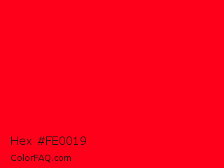 Hex #fe0019 Color is a normal red color and the nearest color is Vivid Red #f70d1a. Hex code #fe0019 and RGB value is rgb(254,0,25). In RGB color space, this color is composed of 100% red, 0% green, 10% blue, In CMYK color space, this color is composed of 0% cyan, 100% magenta, 90% yellow , 0% black , In HSL color space, this color has a hue angle of 354° , 100% saturation and 50% lightness.