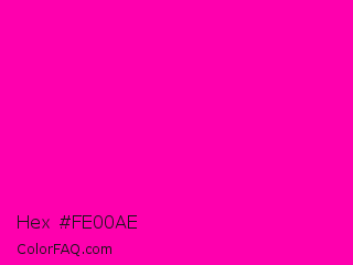 Hex #fe00ae Color is a normal magenta color and the nearest color is Hollywood Cerise #f400a1. Hex code #fe00ae and RGB value is rgb(254,0,174). In RGB color space, this color is composed of 100% red, 0% green, 68% blue, In CMYK color space, this color is composed of 0% cyan, 100% magenta, 31% yellow , 0% black , In HSL color space, this color has a hue angle of 319° , 100% saturation and 50% lightness.