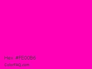 Hex #fe00b6 Color is a normal magenta color and the nearest color is Shocking Pink #fc0fc0. Hex code #fe00b6 and RGB value is rgb(254,0,182). In RGB color space, this color is composed of 100% red, 0% green, 71% blue, In CMYK color space, this color is composed of 0% cyan, 100% magenta, 28% yellow , 0% black , In HSL color space, this color has a hue angle of 317° , 100% saturation and 50% lightness.