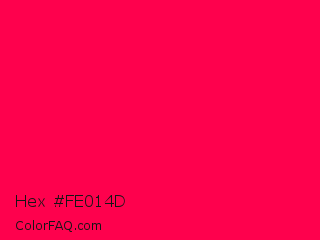 Hex #fe014d Color is a normal rose color and the nearest color is Folly #ff004f. Hex code #fe014d and RGB value is rgb(254,1,77). In RGB color space, this color is composed of 100% red, 0% green, 30% blue, In CMYK color space, this color is composed of 0% cyan, 100% magenta, 70% yellow , 0% black , In HSL color space, this color has a hue angle of 342° , 99% saturation and 50% lightness.