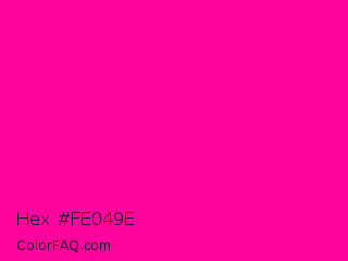Hex #fe049e Color is a normal magenta color and the nearest color is Hollywood Cerise #f400a1. Hex code #fe049e and RGB value is rgb(254,4,158). In RGB color space, this color is composed of 100% red, 2% green, 62% blue, In CMYK color space, this color is composed of 0% cyan, 98% magenta, 38% yellow , 0% black , In HSL color space, this color has a hue angle of 323° , 99% saturation and 51% lightness.