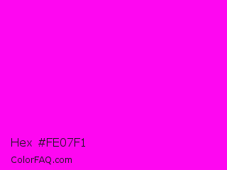 Hex #fe07f1 Color is a normal magenta color and the nearest color is Magenta / Fuchsia #ff00ff. Hex code #fe07f1 and RGB value is rgb(254,7,241). In RGB color space, this color is composed of 100% red, 3% green, 95% blue, In CMYK color space, this color is composed of 0% cyan, 97% magenta, 5% yellow , 0% black , In HSL color space, this color has a hue angle of 303° , 99% saturation and 51% lightness.