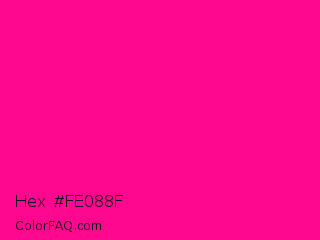 Hex #fe088f Color is a normal magenta color and the nearest color is Magenta Process #ff0090. Hex code #fe088f and RGB value is rgb(254,8,143). In RGB color space, this color is composed of 100% red, 3% green, 56% blue, In CMYK color space, this color is composed of 0% cyan, 97% magenta, 44% yellow , 0% black , In HSL color space, this color has a hue angle of 327° , 99% saturation and 51% lightness.