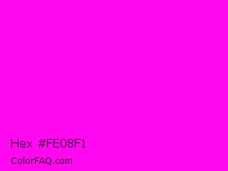 Hex #fe08f1 Color is a normal magenta color and the nearest color is Magenta / Fuchsia #ff00ff. Hex code #fe08f1 and RGB value is rgb(254,8,241). In RGB color space, this color is composed of 100% red, 3% green, 95% blue, In CMYK color space, this color is composed of 0% cyan, 97% magenta, 5% yellow , 0% black , In HSL color space, this color has a hue angle of 303° , 99% saturation and 51% lightness.