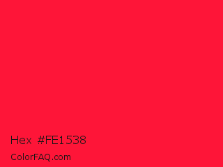 Hex #fe1538 Color is a normal red color and the nearest color is Torch Red #fd0e35. Hex code #fe1538 and RGB value is rgb(254,21,56). In RGB color space, this color is composed of 100% red, 8% green, 22% blue, In CMYK color space, this color is composed of 0% cyan, 92% magenta, 78% yellow , 0% black , In HSL color space, this color has a hue angle of 351° , 99% saturation and 54% lightness.