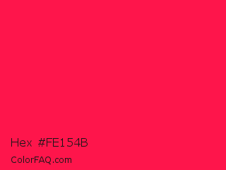 Hex #fe154b Color is a normal red color and the nearest color is Awesome #ff2052. Hex code #fe154b and RGB value is rgb(254,21,75). In RGB color space, this color is composed of 100% red, 8% green, 29% blue, In CMYK color space, this color is composed of 0% cyan, 92% magenta, 70% yellow , 0% black , In HSL color space, this color has a hue angle of 346° , 99% saturation and 54% lightness.