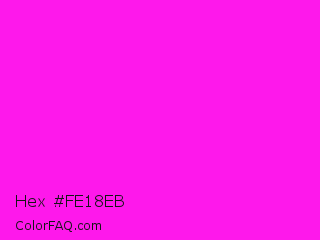 Hex #fe18eb Color is a normal magenta color and the nearest color is Hot Magenta #ff1dce. Hex code #fe18eb and RGB value is rgb(254,24,235). In RGB color space, this color is composed of 100% red, 9% green, 92% blue, In CMYK color space, this color is composed of 0% cyan, 91% magenta, 7% yellow , 0% black , In HSL color space, this color has a hue angle of 305° , 99% saturation and 55% lightness.
