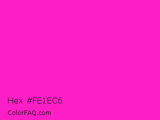 Hex #fe1ec6 Color is a normal magenta color and the nearest color is Hot Magenta #ff1dce. Hex code #fe1ec6 and RGB value is rgb(254,30,198). In RGB color space, this color is composed of 100% red, 12% green, 78% blue, In CMYK color space, this color is composed of 0% cyan, 88% magenta, 22% yellow , 0% black , In HSL color space, this color has a hue angle of 315° , 99% saturation and 56% lightness.
