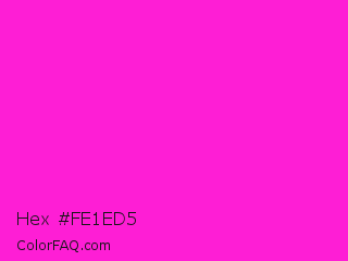Hex #fe1ed5 Color is a normal magenta color and the nearest color is Hot Magenta #ff1dce. Hex code #fe1ed5 and RGB value is rgb(254,30,213). In RGB color space, this color is composed of 100% red, 12% green, 84% blue, In CMYK color space, this color is composed of 0% cyan, 88% magenta, 16% yellow , 0% black , In HSL color space, this color has a hue angle of 311° , 99% saturation and 56% lightness.