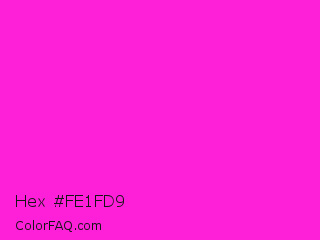 Hex #fe1fd9 Color is a normal magenta color and the nearest color is Hot Magenta #ff1dce. Hex code #fe1fd9 and RGB value is rgb(254,31,217). In RGB color space, this color is composed of 100% red, 12% green, 85% blue, In CMYK color space, this color is composed of 0% cyan, 88% magenta, 15% yellow , 0% black , In HSL color space, this color has a hue angle of 310° , 99% saturation and 56% lightness.