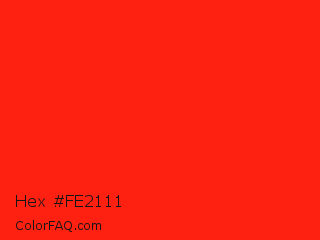 Hex #fe2111 Color is a normal red color and the nearest color is Red RYB #fe2712. Hex code #fe2111 and RGB value is rgb(254,33,17). In RGB color space, this color is composed of 100% red, 13% green, 7% blue, In CMYK color space, this color is composed of 0% cyan, 87% magenta, 93% yellow , 0% black , In HSL color space, this color has a hue angle of 4° , 99% saturation and 53% lightness.