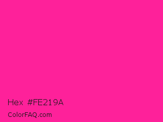 Hex #fe219a Color is a normal magenta color and the nearest color is Persian Rose #fe28a2. Hex code #fe219a and RGB value is rgb(254,33,154). In RGB color space, this color is composed of 100% red, 13% green, 60% blue, In CMYK color space, this color is composed of 0% cyan, 87% magenta, 39% yellow , 0% black , In HSL color space, this color has a hue angle of 327° , 99% saturation and 56% lightness.