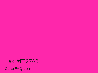 Hex #fe27ab Color is a normal magenta color and the nearest color is Persian Rose #fe28a2. Hex code #fe27ab and RGB value is rgb(254,39,171). In RGB color space, this color is composed of 100% red, 15% green, 67% blue, In CMYK color space, this color is composed of 0% cyan, 85% magenta, 33% yellow , 0% black , In HSL color space, this color has a hue angle of 323° , 99% saturation and 57% lightness.
