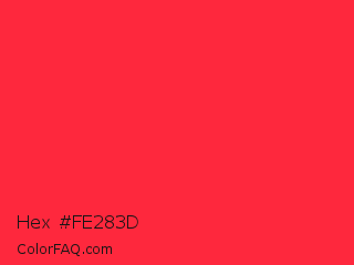 Hex #fe283d Color is a normal red color and the nearest color is Imperial Red #ed2939. Hex code #fe283d and RGB value is rgb(254,40,61). In RGB color space, this color is composed of 100% red, 16% green, 24% blue, In CMYK color space, this color is composed of 0% cyan, 84% magenta, 76% yellow , 0% black , In HSL color space, this color has a hue angle of 354° , 99% saturation and 58% lightness.