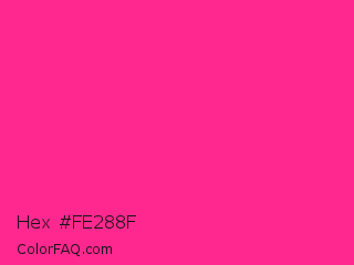 Hex #fe288f Color is a normal rose color and the nearest color is Wild Strawberry Crayola #ff3399. Hex code #fe288f and RGB value is rgb(254,40,143). In RGB color space, this color is composed of 100% red, 16% green, 56% blue, In CMYK color space, this color is composed of 0% cyan, 84% magenta, 44% yellow , 0% black , In HSL color space, this color has a hue angle of 331° , 99% saturation and 58% lightness.
