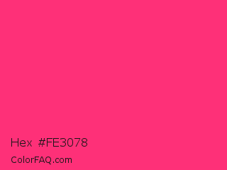 Hex #fe3078 Color is a normal rose color and the nearest color is Cerise Pink #ec3b83. Hex code #fe3078 and RGB value is rgb(254,48,120). In RGB color space, this color is composed of 100% red, 19% green, 47% blue, In CMYK color space, this color is composed of 0% cyan, 81% magenta, 53% yellow , 0% black , In HSL color space, this color has a hue angle of 339° , 99% saturation and 59% lightness.