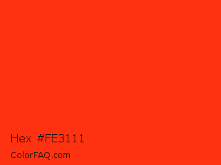 Hex #fe3111 Color is a normal red color and the nearest color is Red RYB #fe2712. Hex code #fe3111 and RGB value is rgb(254,49,17). In RGB color space, this color is composed of 100% red, 19% green, 7% blue, In CMYK color space, this color is composed of 0% cyan, 81% magenta, 93% yellow , 0% black , In HSL color space, this color has a hue angle of 8° , 99% saturation and 53% lightness.