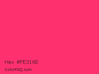 Hex #fe316e Color is a normal rose color and the nearest color is Radical Red #ff355e. Hex code #fe316e and RGB value is rgb(254,49,110). In RGB color space, this color is composed of 100% red, 19% green, 43% blue, In CMYK color space, this color is composed of 0% cyan, 81% magenta, 57% yellow , 0% black , In HSL color space, this color has a hue angle of 342° , 99% saturation and 59% lightness.