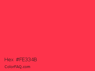 Hex #fe334b Color is a normal red color and the nearest color is Red Salsa #fd3a4a. Hex code #fe334b and RGB value is rgb(254,51,75). In RGB color space, this color is composed of 100% red, 20% green, 29% blue, In CMYK color space, this color is composed of 0% cyan, 80% magenta, 70% yellow , 0% black , In HSL color space, this color has a hue angle of 353° , 99% saturation and 60% lightness.