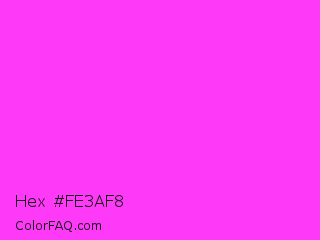 Hex #fe3af8 Color is a light magenta color and the nearest color is Purple Pizzazz #fe4eda. Hex code #fe3af8 and RGB value is rgb(254,58,248). In RGB color space, this color is composed of 100% red, 23% green, 97% blue, In CMYK color space, this color is composed of 0% cyan, 77% magenta, 2% yellow , 0% black , In HSL color space, this color has a hue angle of 302° , 99% saturation and 61% lightness.
